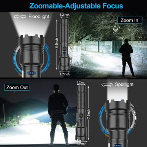 1.Super Bright LED flashlight—Upgrade High Lumen XPH50 LED, illuminate 10000 lumen easily light up over the length of whole football fields 100 times brighter than old incandescent lights. 10times Brighter then normal led lashlight.