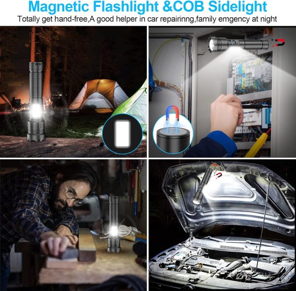 Magnetic Flashlight Flashlight & COB Sidelight: Magnetic LED Flashlight with Powerful Magnet base, allow you fix this led flashlight on any metal surface to really free your hands, bright LED flashlight with cob sidelight, Best Combination as a work flashlights for emergencies, Car Repair, Garage work, camping use.