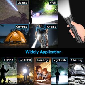 8.Water resistant — This high lumen flashlight is IPX6 waterproof, perfectly used in the rain, snow or emergency situations. Ideal for use around the house, dog walking, camping, hiking or fishing.