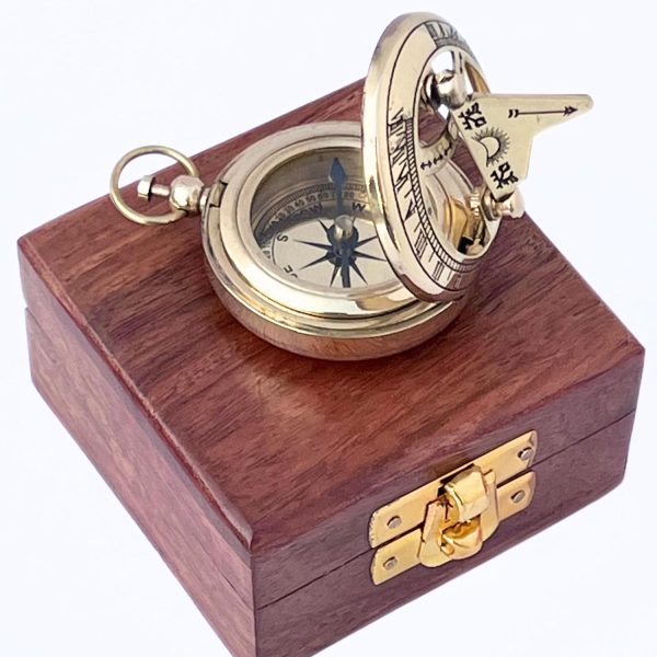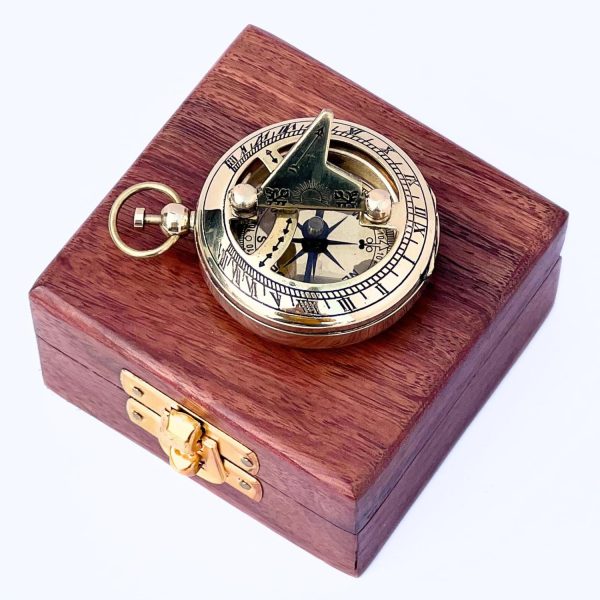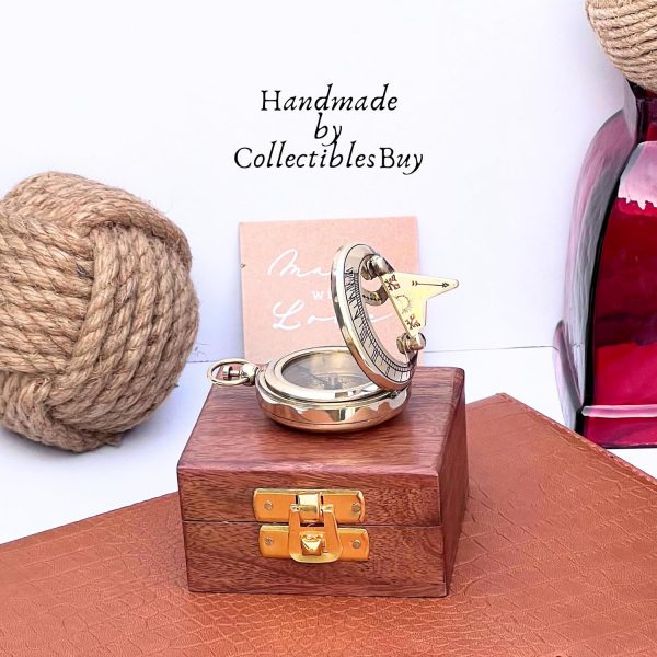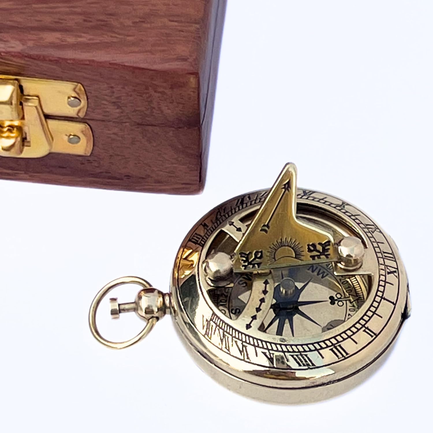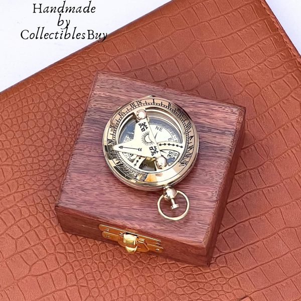 Marine Sundial Compass with Nautical Solid Wooden Box Vintage Brass Ship Navigate Device Nautical Gift Collection