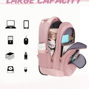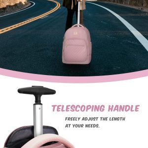 Dimensions&STURDY MATERIAL: Dimensions: 20 X 14.6 X 8.7 inch, Item WEIGHT: 4.93 pound. This rolling backpack for women is built from quality waterproof nylon material with double metal zipper, sturdy aluminum telescoping handle. Comfortable breathable mesh shoulder straps with sturdy metal hooks and strong reliable wheels design can relieve the stress from your shoulder, make it ideal for daily use and travel.