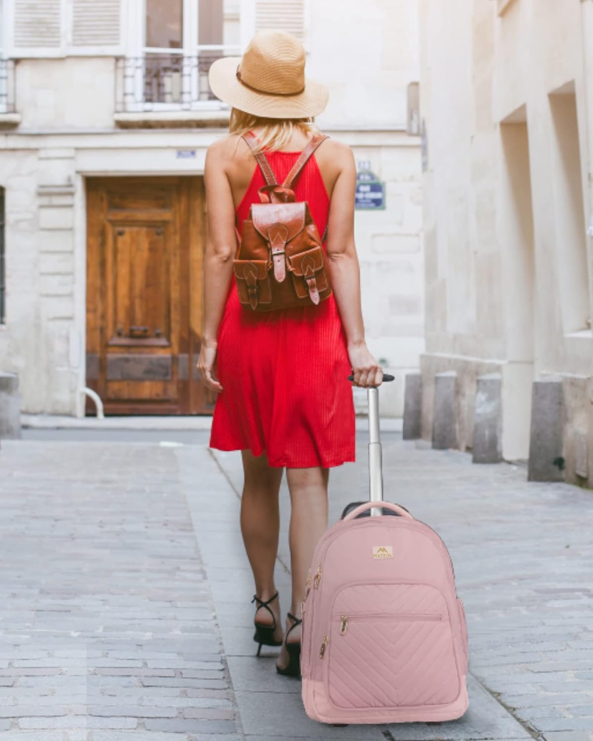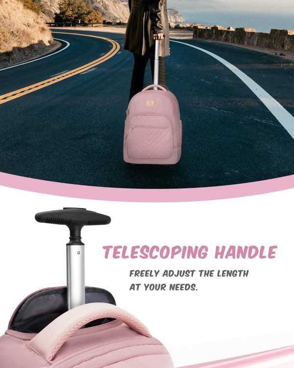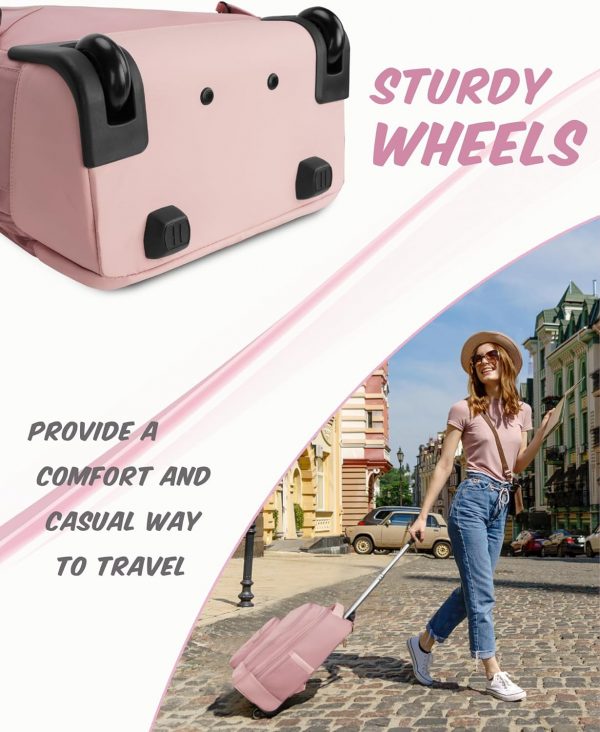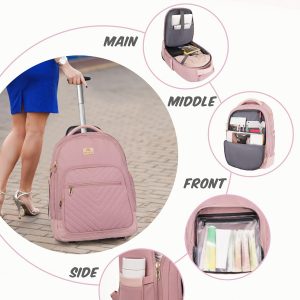 Comfortable and TSA-Friendly Design: This roller backpack for women adopt TSA-Friendly design, it can be unfolded 180 degrees and get through airport security quickly. Padded mesh back straps provide you comfort back support. Wet/Dry separation pocket can store tooth brush or other damp items separately. Smooth wheels can remain silent when this backpack rolls on the road. The telescoping handle can be adjusted up to two sections high, you can move this backpack smoothly without bending down.