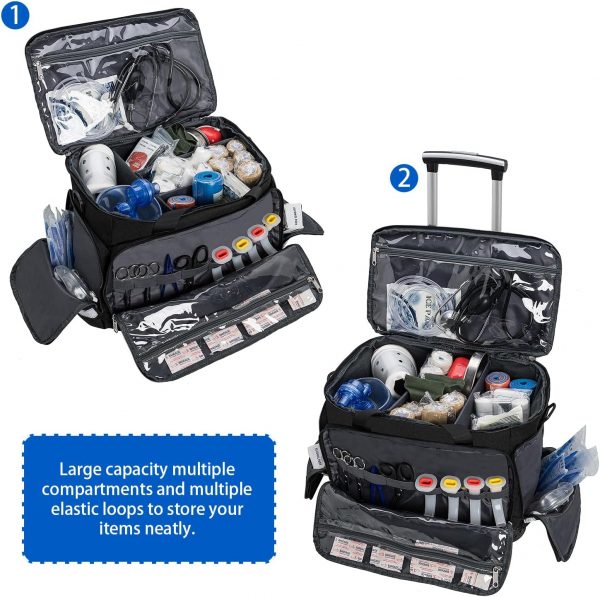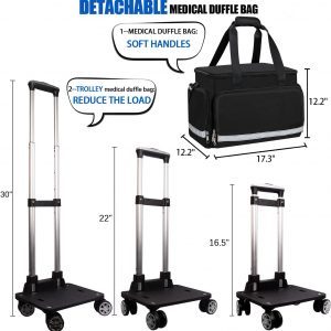 Durable and Reliable Construction: Crafted from high-quality materials, this medical rolling duffle bag is built to withstand the demands of daily use. The bag is made from rugged, water-resistant fabric that protects your valuable medical equipment from the elements. Reinforced stitching and sturdy zippers enhance durability, ensuring long-lasting performance and peace of mind.