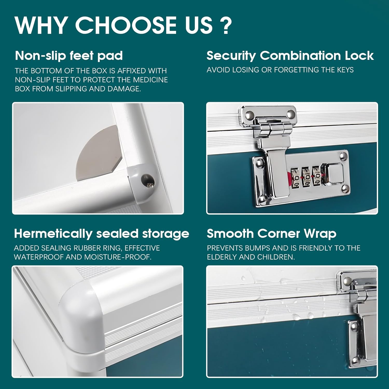 COMBINATION LOCK BOX: Glosen medicine lock box is combination lock style to ensure the safety of your medicine, the initial password is 000, by pressing the square button to the right to open.
