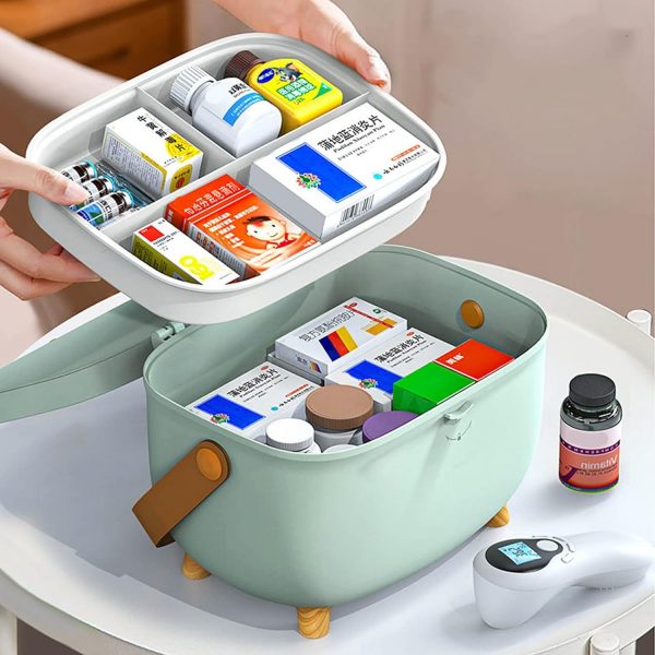 Medicine Storage Box, Oval Medicine Box Organizer Storage, Plastic First Aid Container Bin with Removable Tray and Portable Handle, Family Emergency Medicine Kit Case Organizer for Office (Green)