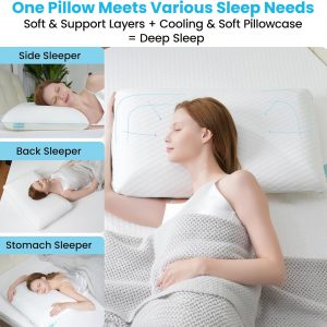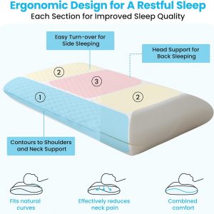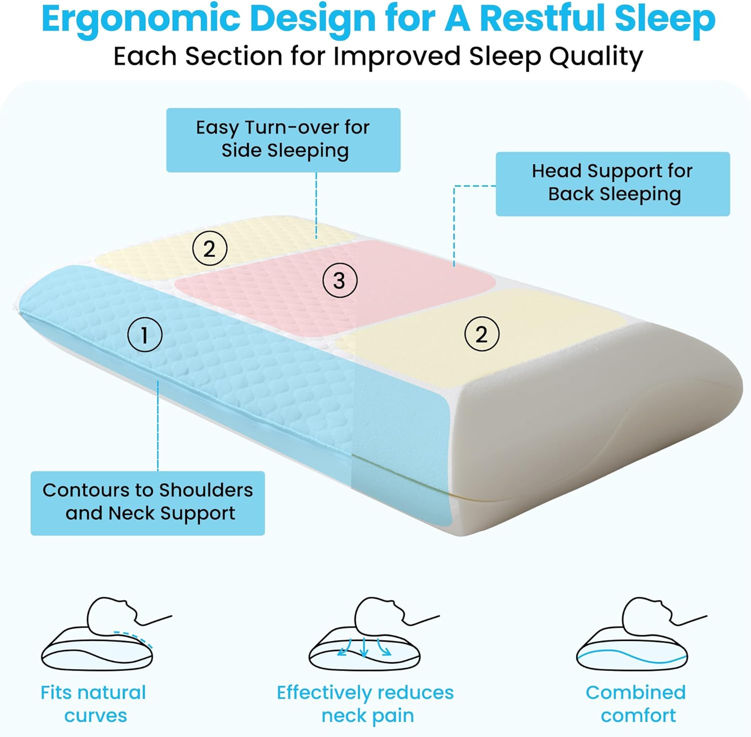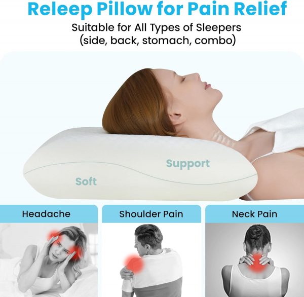 【Ergonomic Design for All Sleepers】- This memory foam pillow offers 4 firmness levels for different sleeping positions—side, back, and stomach sleeping. Designed with ergonomic 3-zone promoting deeper sleep. The cervical neck pillow not only supports your shoulders and neck but also maintains a natural neck curve for maximum comfort. With gentle contouring and ample neck support, it evenly distributes pressure, reducing fatigue and pain. Healthy sleep begins with the Releep ergonomic pillow.