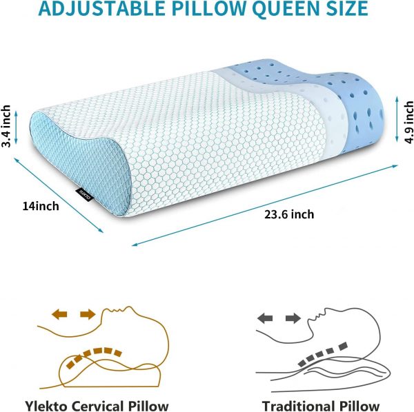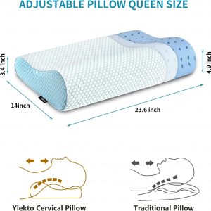 【2 Adjustable Heights for Any Sleep Style】 The foam pillow is with size: 23.6 x 14 x 4.9/3.4 inches ( L x W x H). There are two available neck support heights to support your neck and head. The ergonomic and supportive pillow for neck pain is designed for multiple sleeping positions, such as side sleeping, supine, stomach sleeping, back sleeping and low pillow sleepers etc.