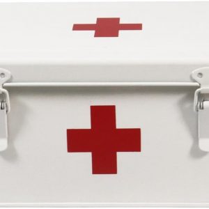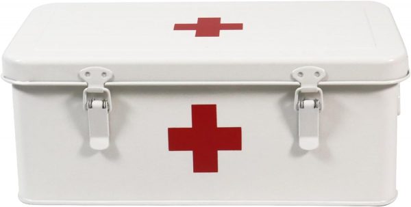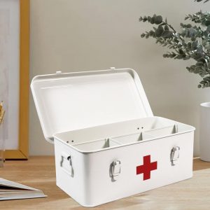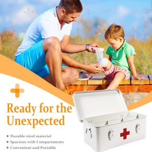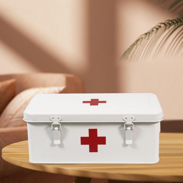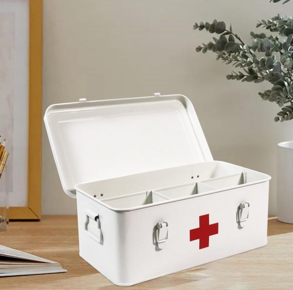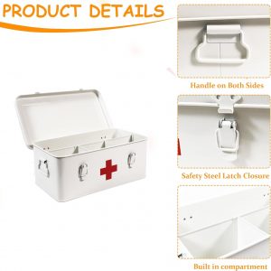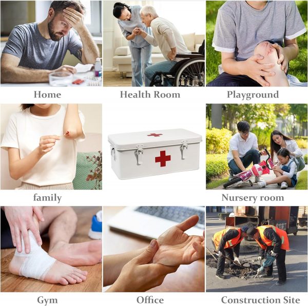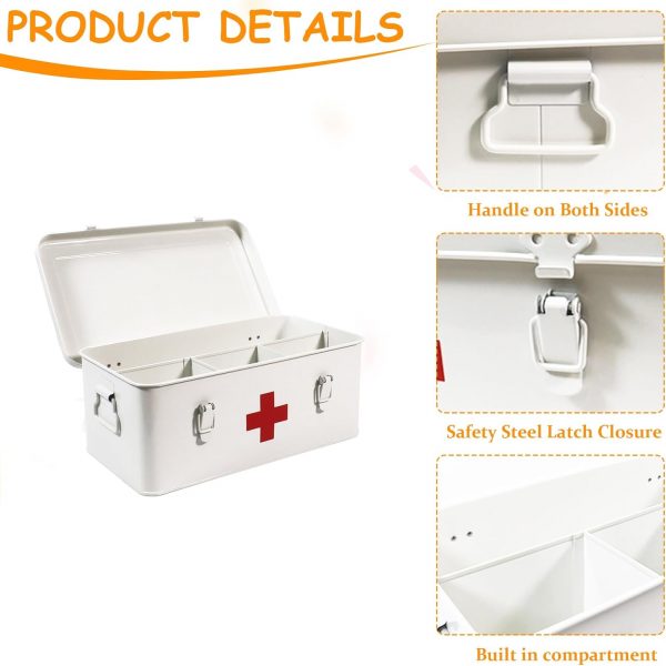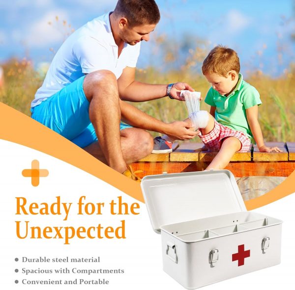 Mowhut First Aid Box, First Aid Kit Supplies Organizer, First Aid Kit Empty with Safety Lock & Portable Handles, Medicine Box with Red Cross, Metal Storage Bin for Home Emergency Tool Set – White