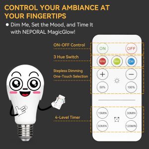 A19 FITS ALL LAMPS – Concerned that rechargeable LED bulbs might be too hefty for your lamp harp or that puck lights won’t suit your table lamp? Fret not! MagicGlow’s A19 size is a universal standard, compatible with most LED light bulb fixtures.[ Control at your fingertips ] Each pack includes 4 rechargeable light bulbs with 2 remote, 4 portable hooks, and 2 charging cables. One remote manages multiple battery operated light bulbs, or simply touch the switch on each magic light bulb like a flashlight. With a two-year warranty and 24/7 customer service, Neporal MagicGlow guarantees your satisfaction.