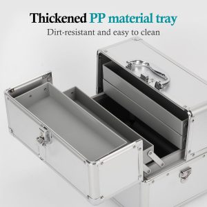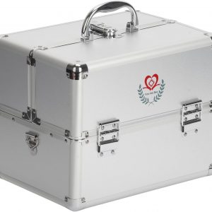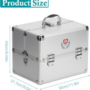 The locking medicine storage box is made of aluminum alloy frame. It is 11.81 x 8.54 x 9.45 inches which can accommodate various medications in your home life.