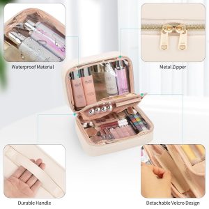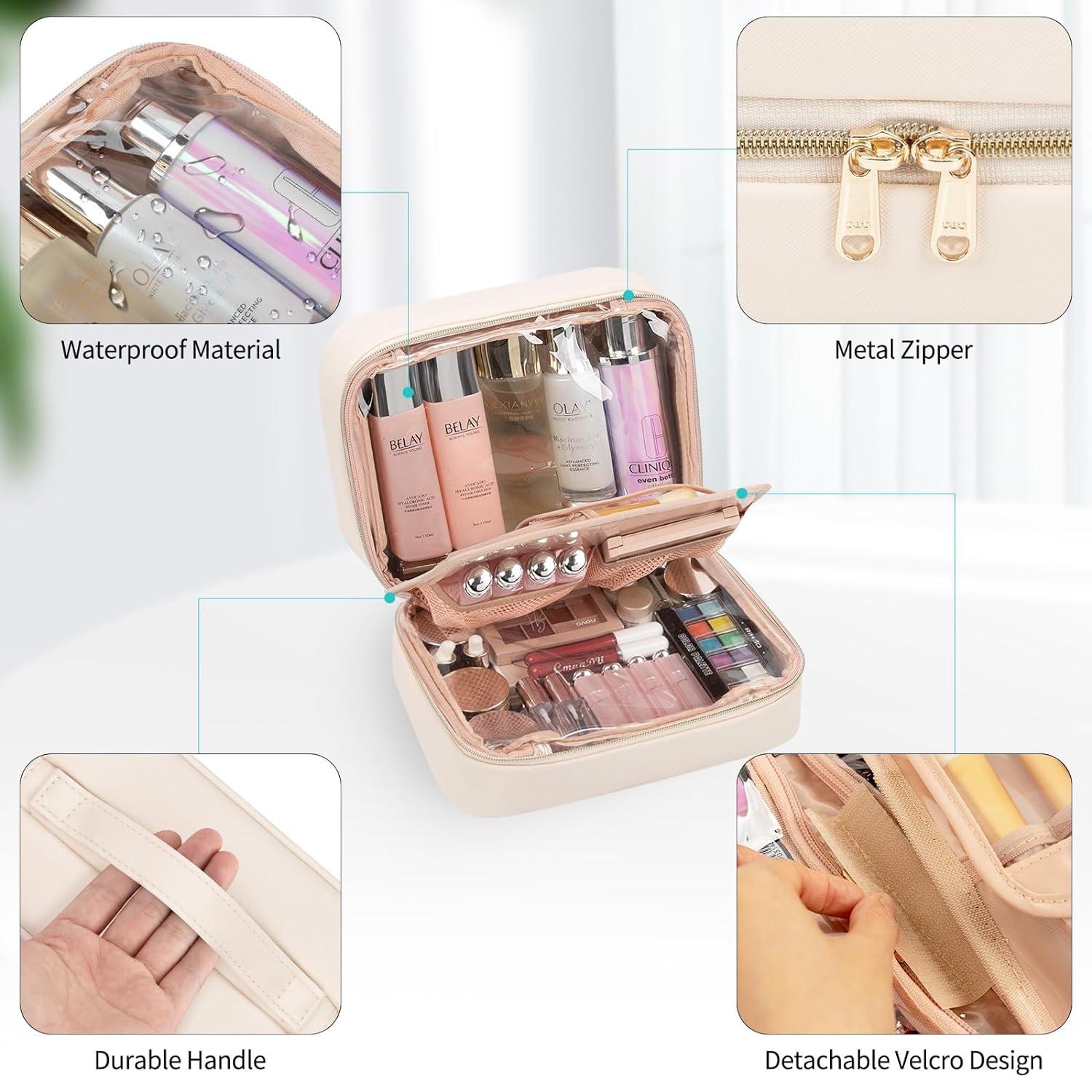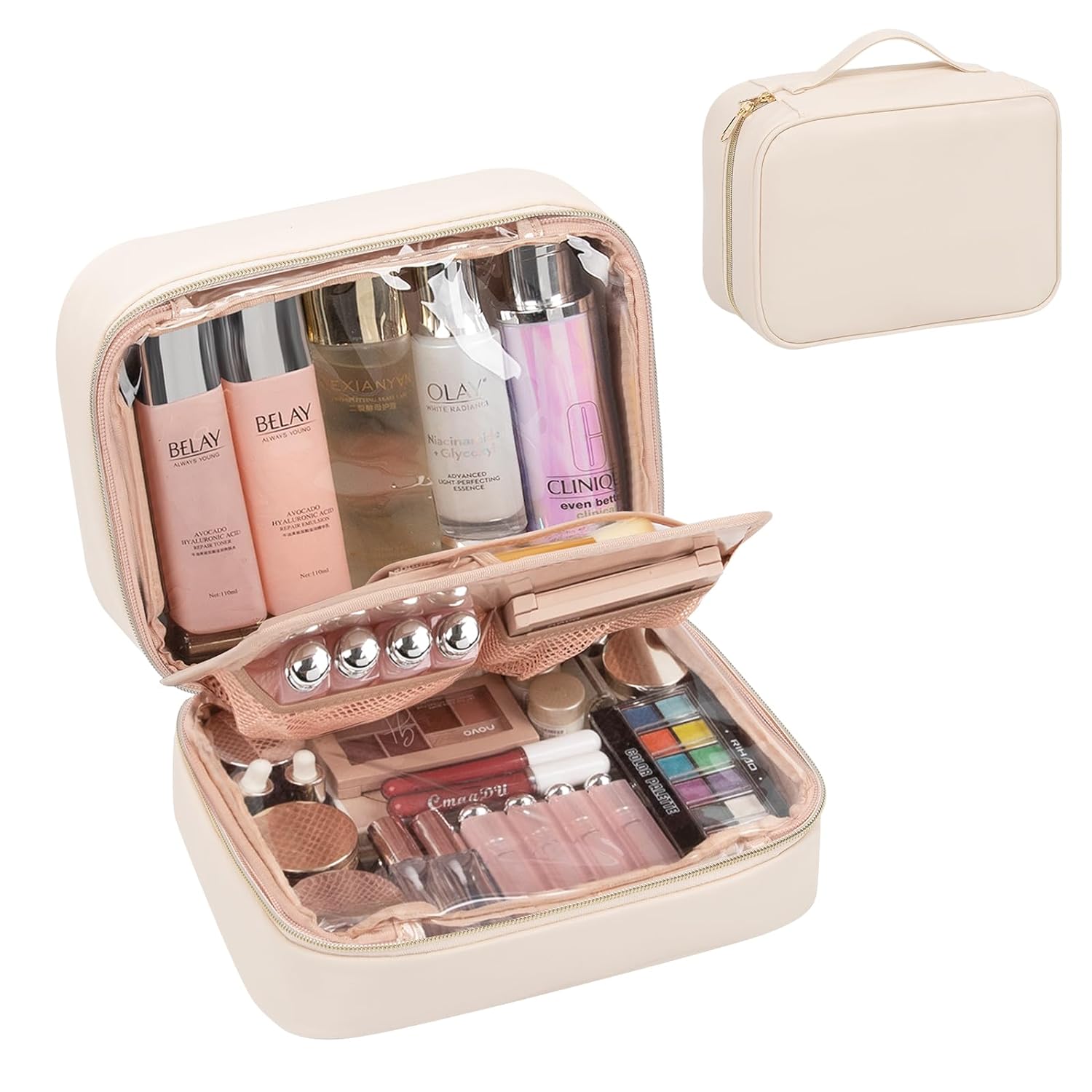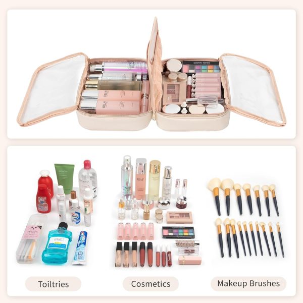 【CONVENIENT DESIGN 】 – Wide-open design makeup bag brings a easier way for you to take your cosmetics. Waterproof PVC transparent window is convenient to view the items, but also can well protect cosmetics.Top leather carry handle is easy to carry. High quality double-way zippers make this cosmetic bag easy-pulling