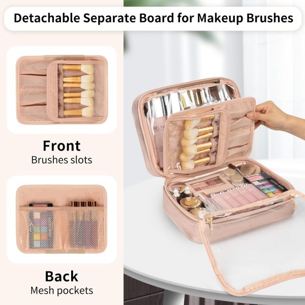 【MULTIPLE STORAGE COMPARTMENTS 】 – The makeup bag has two main compartments, a separate board for makeup brushes, has elastic sots and two mesh pockets , and multiple compartments to keep your cosmetics organized. The waterproof lining makeup bag is easy to clean, and you’ll never have to worry about your bag or items getting dirty again