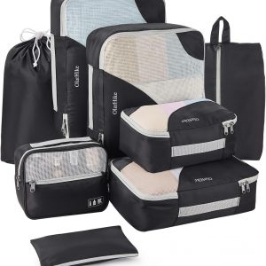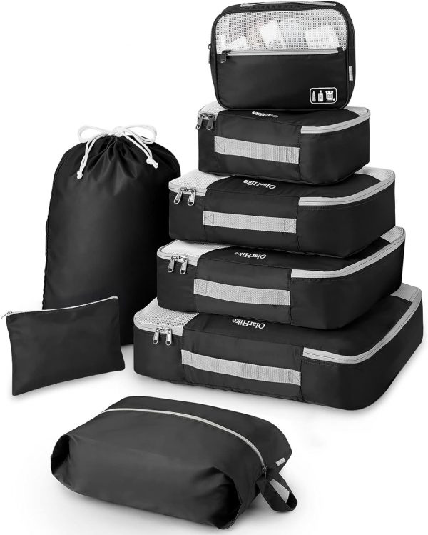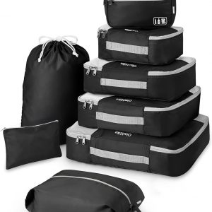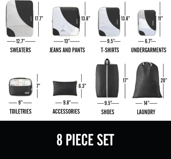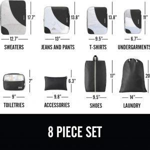 Perfect Fit for All Travel Needs: 4 sized packing cubes, 1x toiletry bag, 1x laundry bag, 1x shoe bag, 1x accessory bag, for essentials like jackets, shirts, shoes, pants, underwear, toiletries, and more. Laundry bag keeps soiled clothing separate.