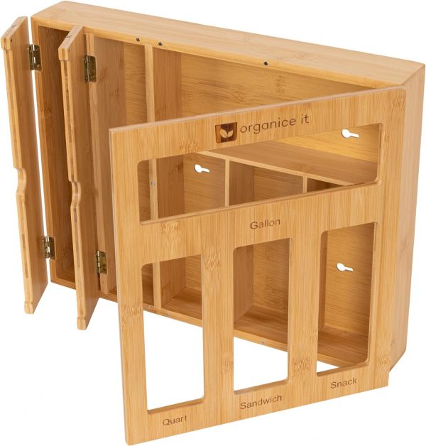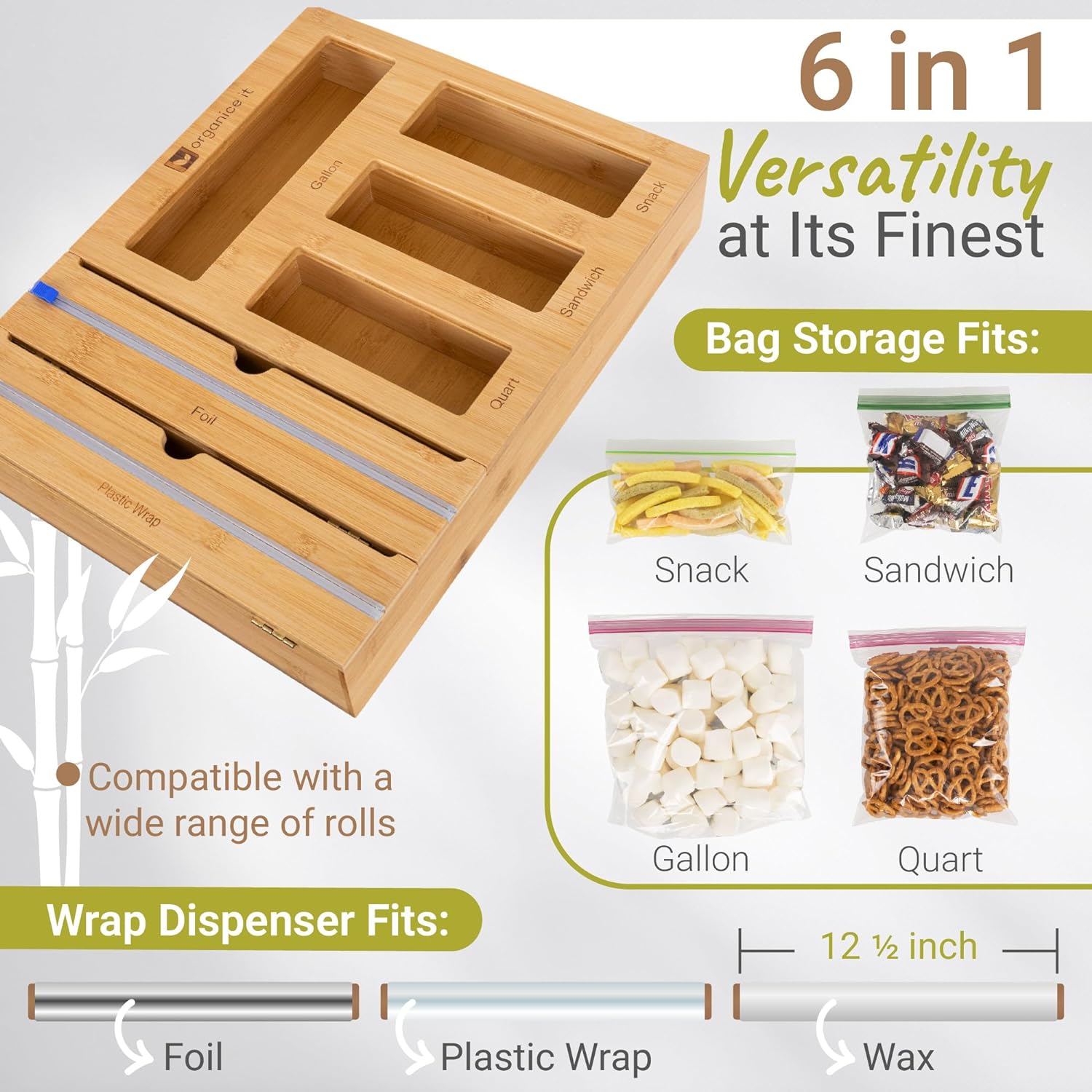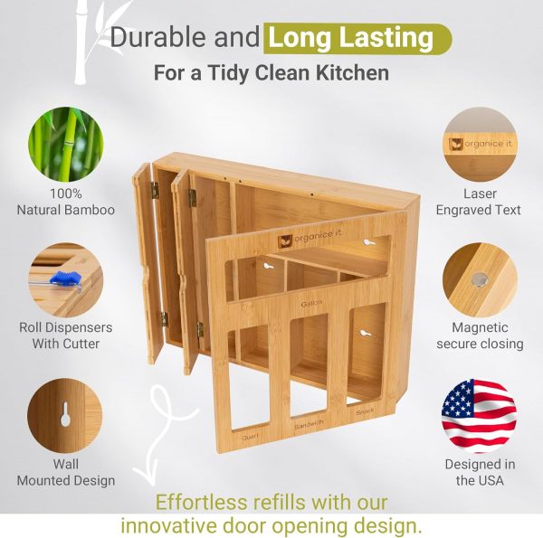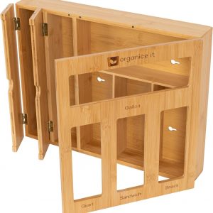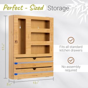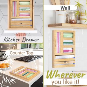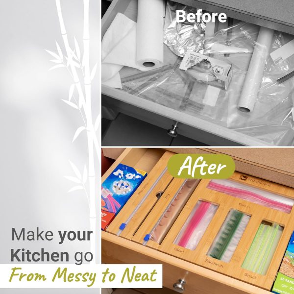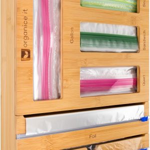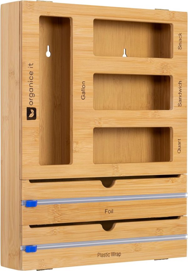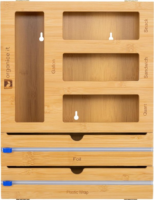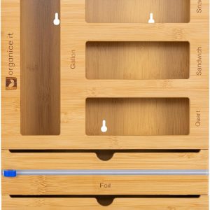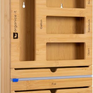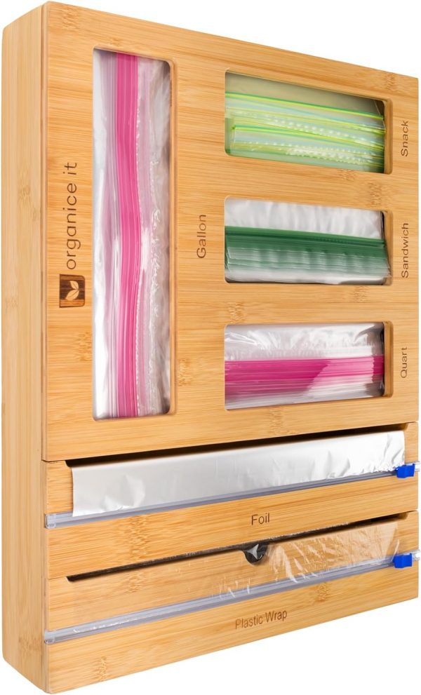 Organice it storage bag organizer compatible with ziplock bag organizer food bag kitchen drawer organizer and plastic wrap dispenser with cutter kitchen organizer for all freezer bags for Gallon Quart