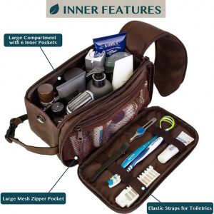 PAVILIA Toiletry Bag for Men, Travel Essentials Shaving Dopp Kit, Mens Travel Bag Toiletries Organizer Case for Grooming, PU Leather Water Resistant Cosmetic Bag Pouch (Dark Brown)