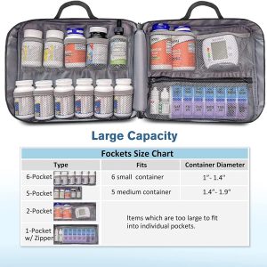 * Utility portable bag Dimensions: 11” * 9,5” * 4,5” (27,9*24,1*11,4 cm). This medicine travel bag is in portable size, while can hold various medication bottles.