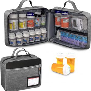 Pill Bottle Organizer : * Easy to Carrying * Great Gift Idea * This medicine organizer made from quality water resistant polyester exterior equipped with durable YKK zipper * Pill box bottle organizer bag size: 11 * 4,5 * 9,5 inch * PORTABLE MEDICINE BAG: Great for travel, hospital, doctor, caregiver, vacation, or emergency. Take it with you. ** * Ideal for traveling, camping and other activities * Ideal for keeping all your pills and other medical supplies organized, fit for various diameter bottles. Perfectly portable size and sturdy handle, making it ideal for traveling, camping and other activities. Go anywhere without worry about forgetting to keep your essential medications, vitamins or medical supplies. * This products is the Pill Bottle Organizer Bag only, bottles and accessories are note included. Great gift for Veteran’s day and Parent’s Day!