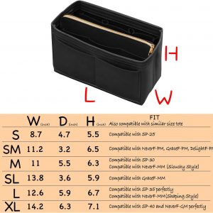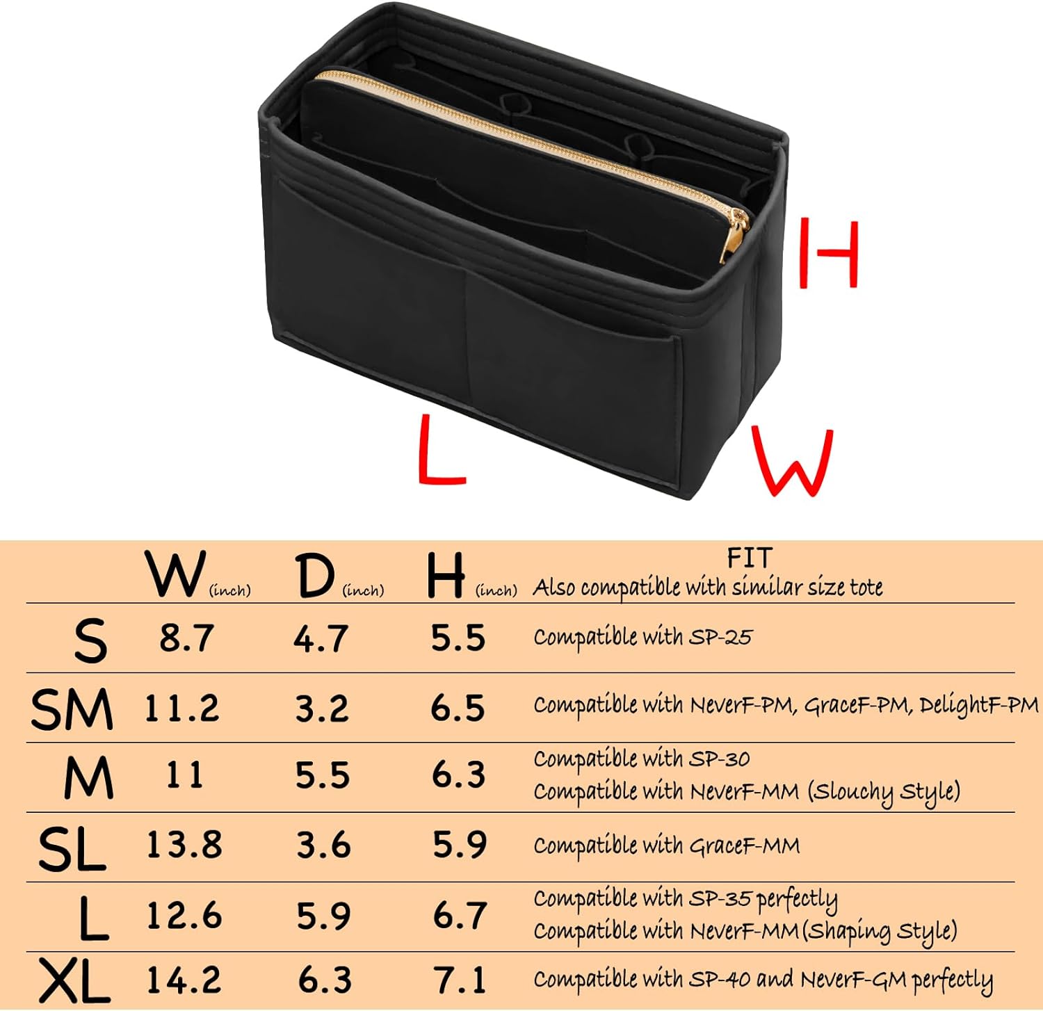 【SIZE OF FELT BAG ORGANIZER】S=8.7″W x 4.7″D x 5.5″H, compatible with SMALL MJ TOTE, SP-25. SM= 11.2″W x 3.2″D x 6.5″H, compatible with NeverF-PM, GraceF-PM, DelightF-PM. M=11″W x 5.5″D x 6.3″H, compatible with MEDIUM MJ TOTE, SP-30, compatible with NeverF-MM(Slouchy Style). SL=13.8″W x 3.6″D x 5.9″H, compatible with GraceF-MM. L=12.6″W x 5.9″D x 6.7″H, compatible with SP-35, compatible with NeverF-MM(Shaping Style). XL=14.2″W x 6.3″D x 7.1″H, compatible with LARGE MJ TOTE, SP-40 and NeverF-GM.