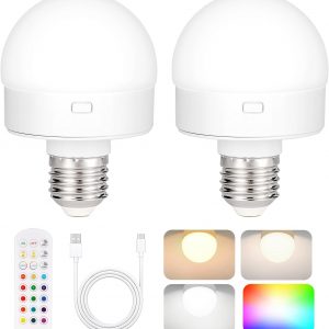 Rechargeable Battery Operated Light Bulb with Remote Control 2 Packs, 350LM Dimmable Detachable LED Bulb with 15 Colors Selectable & 3 Timer, Wireless Puck Light Bulb for Wall Sconce, Non-Hardwired