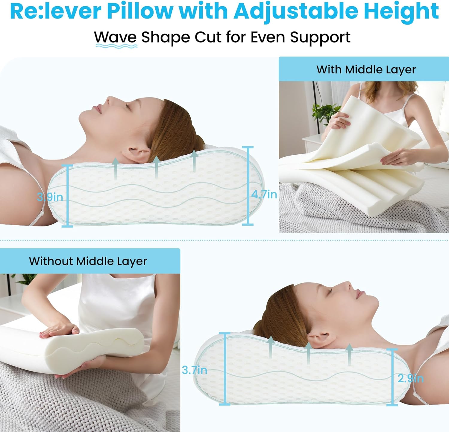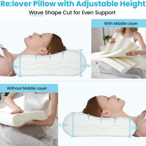 【Re:lever Pillow with Adjustable Height】- Releep Re:lever Pillow features a unique design with adjustable WAVE-SHAPED lofts. It accommodates various sleepers, providing EVEN SUPPORT when adjusting the height and effectively relieving pressure. Originally contour pillow height: 4.7in (high contour) / 3.9 in (low contour). The Middle layer can be removed to decrease the thickness to 3.7in (high contour) / 2.9in (low contour).