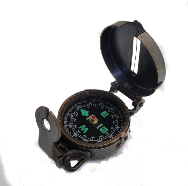 The front sight has a magnifier to simultaneously view the magnetic heading when taking a sight and on the side of the brass compass housing is a needle freeze mechanism to hold a reading