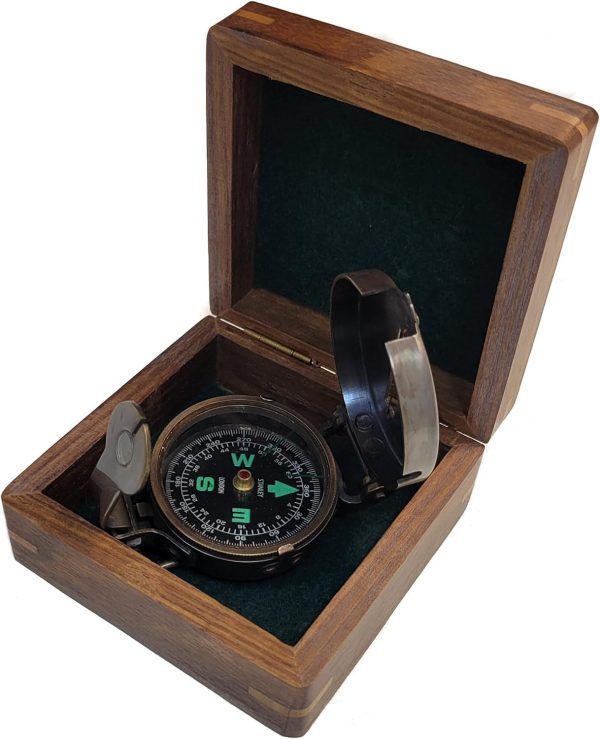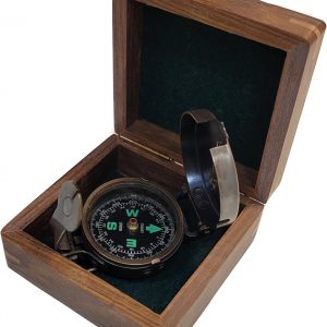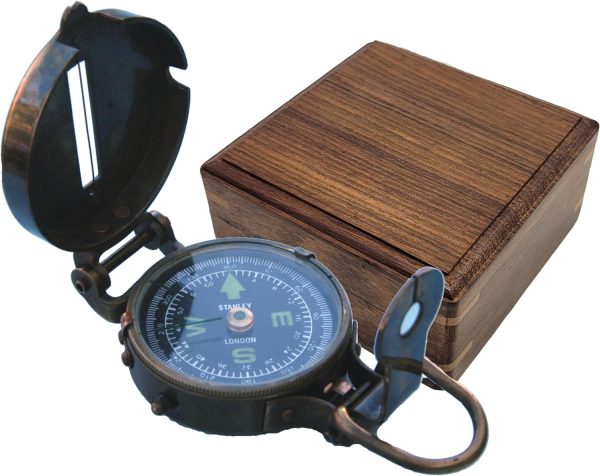 The Lensatic Compass became the standard issue compass during World War II. As the successor to the M-1938 Prismatic Compass, the Lensatic Compass was simpler and cheaper to manufacture. This Stanley London solid brass reproduction of a Military Lensatic Compass easily folds to fit in your pocket. The compass card has both the standard 0 – 360 degree scale, as well as the 0 – 64 Mil scale (one yard at 1,000 yards). The cardinal points are luminous for easy glow-in-the-dark viewing. This brass pocket compass features a standard glass bezel with two lines at 45 degree angles. The bezel also rotates with detents so you can change the heading reference a known amount without looking at the lensatic compass. The front sight has a magnifier to simultaneously view the magnetic heading when taking a sight. Folding the sight down operates a needle lift mechanism to protect the compass bearing. On the side of the brass compass housing is a needle freeze mechanism to hold a reading. The brass pocket compass measures 2 1/8 inches (5.4 cm) in diameter, 7/8 inches (2.2 cm) thick, and weighs 4.9 ounces (139 grams). This compass is beautifully crafted from solid brass and has a rich antique patina. Your personalized compass inscription can be engraved on the front or back of the brass lensatic compass.
