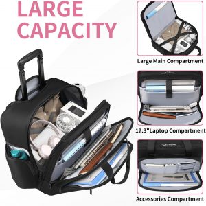 【Multifunctional Compartments】Multiple compartments are designed to provide separate space for your 17.3-inch laptop and all your belongings. It can easily store your laptop, clothes, iPad, wallet, documents, and all your daily essentials for overnight trips. Two side zippered pockets for your umbrella, water bottle, etc. When you travel, this rolling laptop bag can carry all items you need for life and work. The main compartment can hold 2-3 days’ worth of clothing.