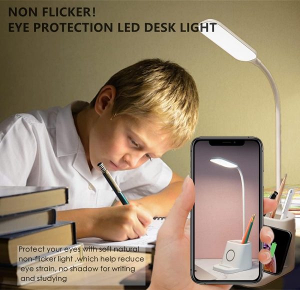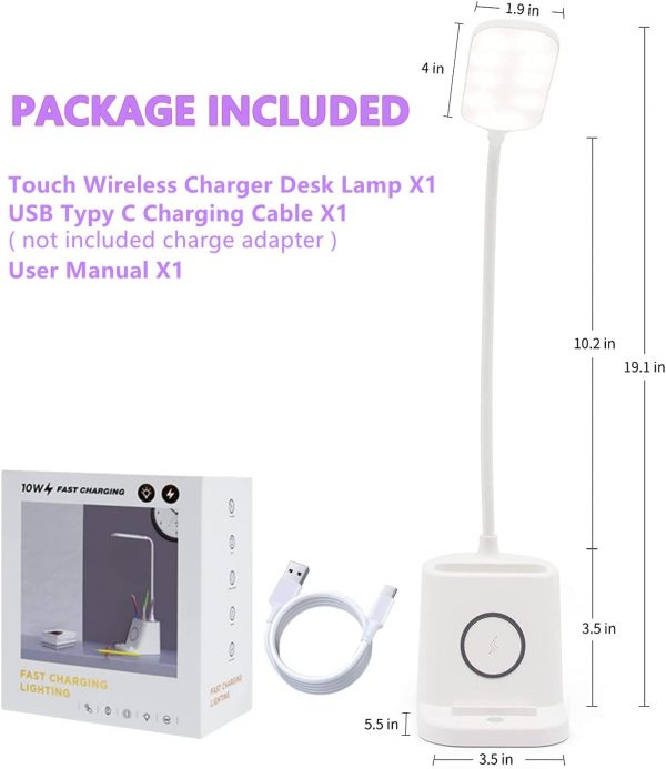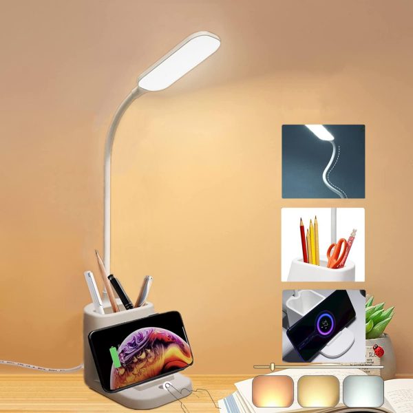 ✨Powerful Charging Desk Lamps: Modern white desk lamp with 10W wireless charger & pen holder. Just put your phone in the phone holder position, the desk lamp will charge immediately, you also can play your favorite movie when charging.The desk lamp works for compatible iPhones, Samsung, and part of devices and fast-charge your smartphone at 10W. Note: An overly thick phone case may affect wireless charging(do not work for the phone of Google Pixel 4a 5G)