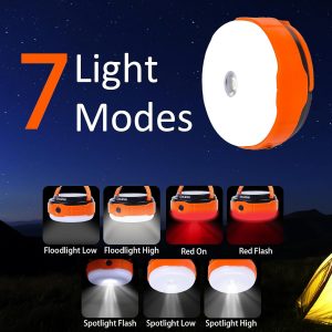【Camping Bright Tent Light 】Camping lights have two light sources: floodlights and spotlights. The flood light includes 28 pcs LED bulbs carrying 360° of 500LM, equivalent to 5W bulb. In the middle of the floodlight is a1pcs 3W spot light of 110LM, which make this rechargeable lantern incredible bright.