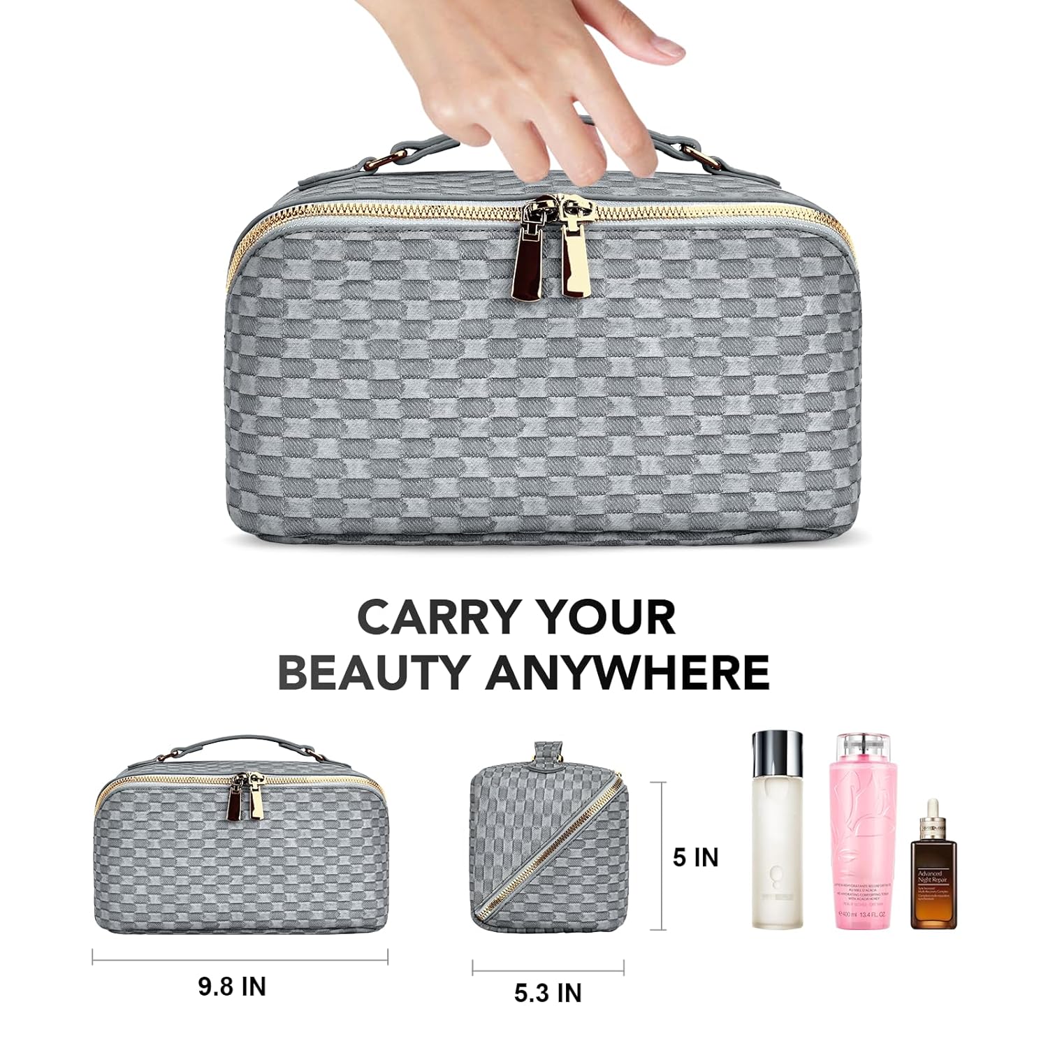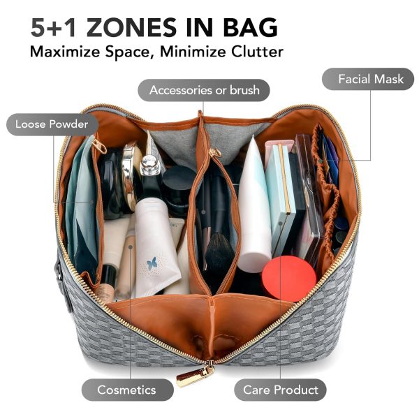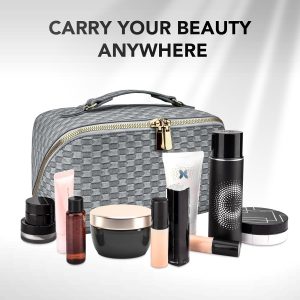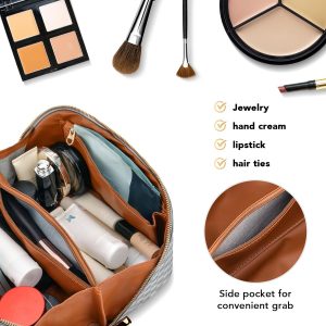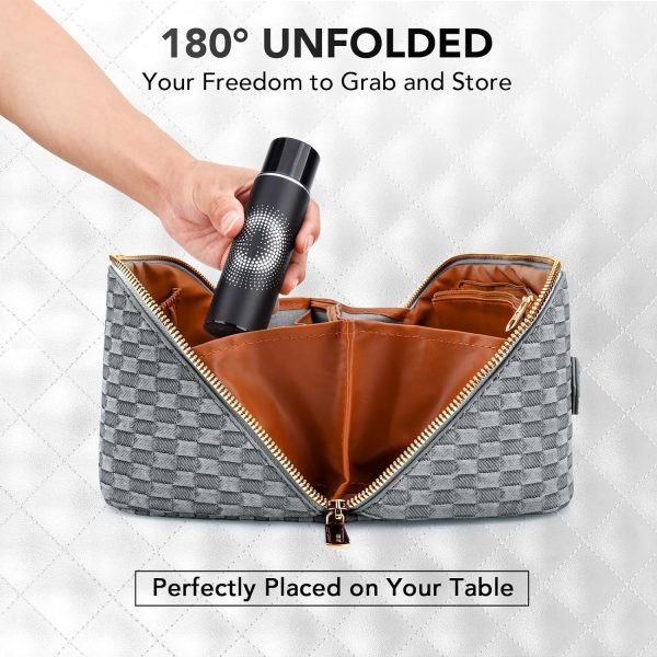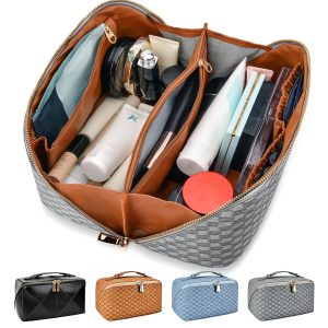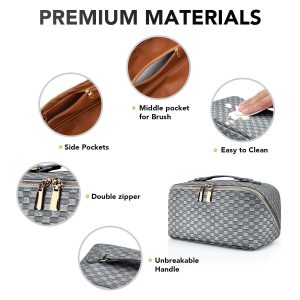 stona Travel Makeup Bag for Women, Large Capacity PU Leather Waterproof Checkered Cosmetic Bags, Portable Pouch Open Flat Toiletry Bag, Make up Organizer with Divider and Handle