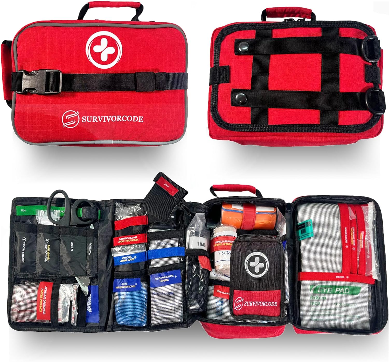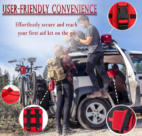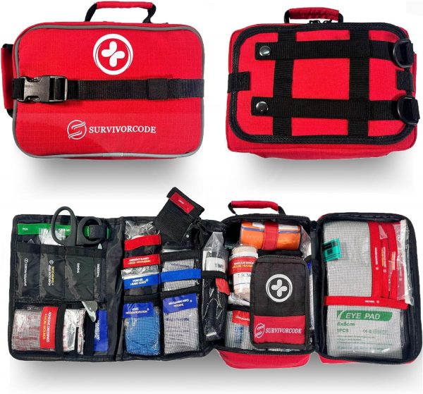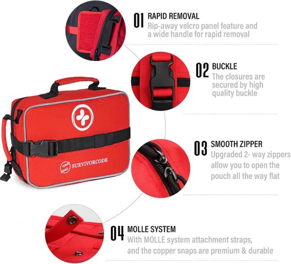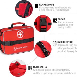 Quick CPR Access: This first aid kit stands out with its removable CPR pouch, ensuring immediate access to life-saving techniques. Whether it’s at home or on the go, having CPR supplies readily available can be a critical factor in an emergency.Efficient Organization: What sets this kit apart is its meticulous organization. Labeled compartments eliminate the need for frantic searching during crises, allowing you to respond promptly to injuries or emergencies without delays.Durability: Crafted from robust 600D Polyester, this kit is built to endure harsh conditions. Its rugged construction ensures the integrity of your essential supplies, ensuring they remain intact and ready for use, even in challenging environments.Rapid Access: The well-thought-out design of this first aid kit ensures swift and clear access to supplies when time is of the essence. In high-pressure situations, quick access to necessary items can significantly impact the outcome of an emergency.Versatile and Portable Travel Companion: This first aid kit is a versatile and highly portable travel companion. Its adaptability shines through with removable MOLLE-compatible components, making it suitable for various scenarios, including cars, homes, or any on-the-go situation. Whether you’re at home or embarking on a travel adventure, this kit ensures you’re prepared for emergencies wherever you go.Personalized Space and Customization: This first aid kit offers a personalized space and customization options, recognizing that every individual and family has unique preferences and medication requirements. With a specialized compartment, you can tailor your kit to meet specific health needs, enhancing your level of preparedness and safety.