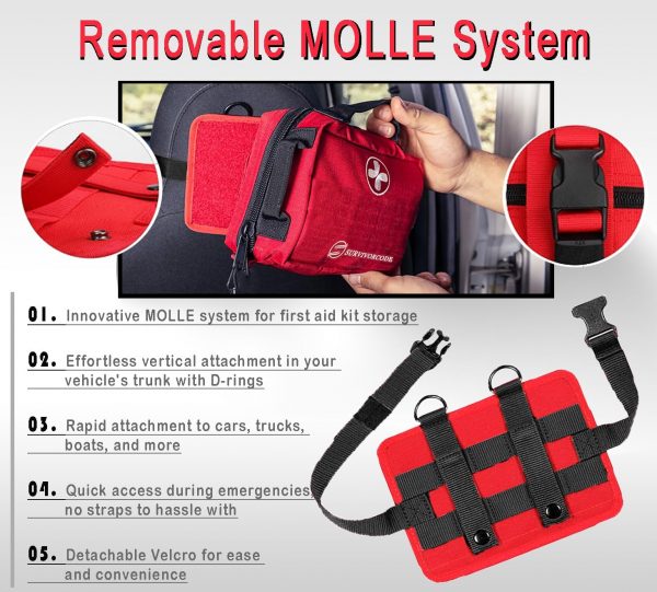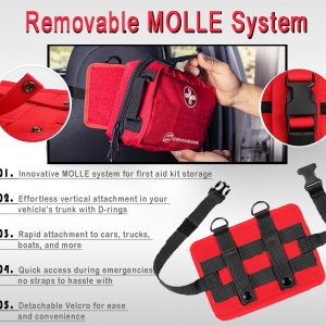 Travel Essentials: Designed with removable MOLLE compatible straps, snaps, and an advanced mounting system, this versatile first aid kit is perfect for your car, home, or any other situation where you need emergency preparedness. Its adaptable nature allows it to be easily customized to meet your specific needs, making it the ultimate travel companion.