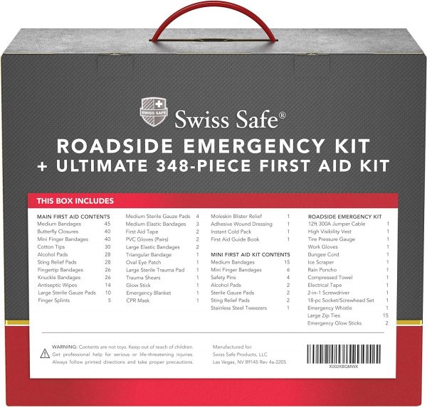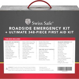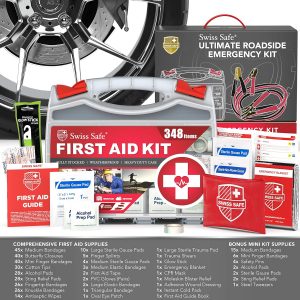 Premium Jumper Cables – 8-Gauge, 300-Amp, 12-foot Jumper Cables for small/midsize/large automobiles.Ice Scraper – For clearing windshield ice buildup in subzero winter conditions.Tire Pressure Gauge – For checking proper tire pressure from 5 to 50 PSI.Reversible Screwdriver – Dual-headed screwdriver with reversible flat/phillips heads.Work Gloves – Heavy duty work gloves to keep your hands clean.Socket Set – 18-Piece Socket Set with locking ¼” driver, 5-13mm sockets, 8 screw bits, and 2″ extender.Electrical Tape – ¾” x 30′ Electrical Insulating Tape for emergency repairs.Compressed Towel – Ultra-compressed towel for cleanup after roadside repairs.Emergency Poncho – Rainproof/weatherproof poncho for roadside situations.Safety Vest – High-visibility safety vest with reflective night stripes for extra visibility.Emergency Whistle – Extra-loud whistle for emergency signaling situations.Glow Sticks – Long-lasting glow sticks for emergency signaling and illumination.Bungee Cord – 3-ft bungee cord for strapping and securing items.Zip Ties – 12″ Zip Ties for securing miscellaneous cables and tubes.