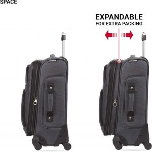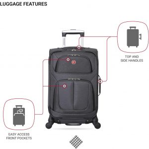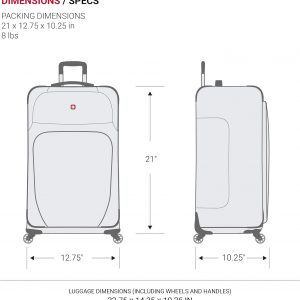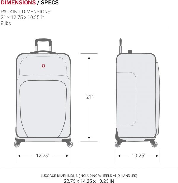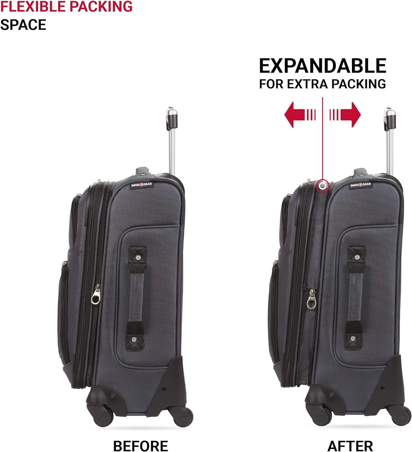 SwissGear Sion Softside Expandable Carry-On Spinner Luggage gives you an ample amount of packing space when needed. This rolling suitcase features a locking push/pull handle system and four 360-degree multi-directional spinner wheels for convenient portability. It is made from a durable, scuff-resistant polyester fabric and its interior is fully lined. This carry-on suitcase features adjustable luggage tie-down straps for securing garments in place, a removable zippered wet bag, a large mesh lid pocket, and a packing pocket for holding small items and accessories. It also includes two front panel pockets, a built-in ID tag, and padded top and side handles. At SwissGear, we continue to ensure whatever you need travels easily, safely, and stylishly with you. Great for a family trip or business travel.