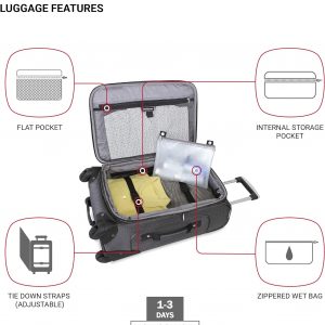 Effortless Organization: This luggage bag maximizes packing efficiency with a removable zippered wet bag, large mesh lid pocket, and packing pocket for holding small items and accessories