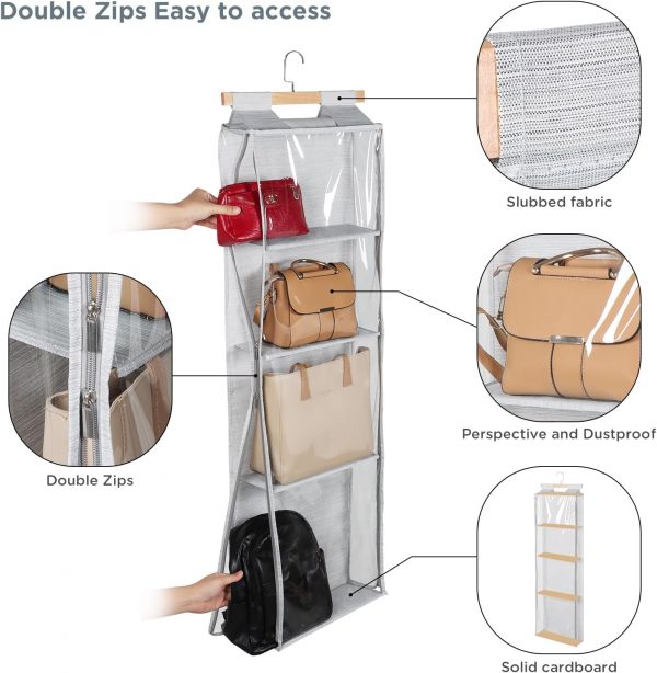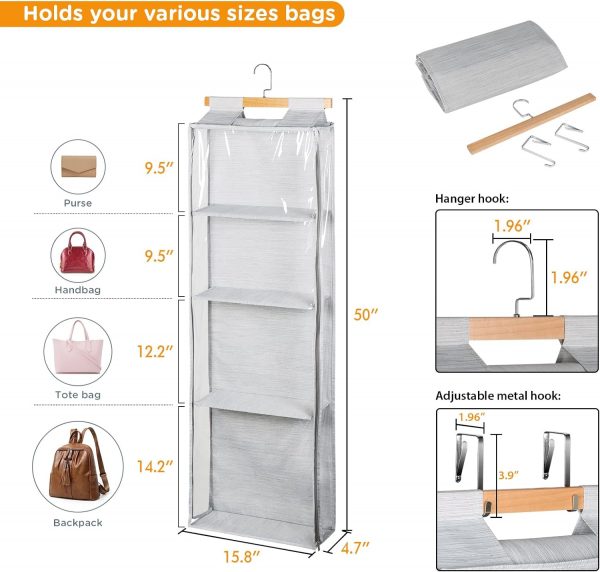 The hanging closet handbag organizer is made of premium bamboo joint fabric and thicker PVC, which is sturdy, durable and easy to clean.