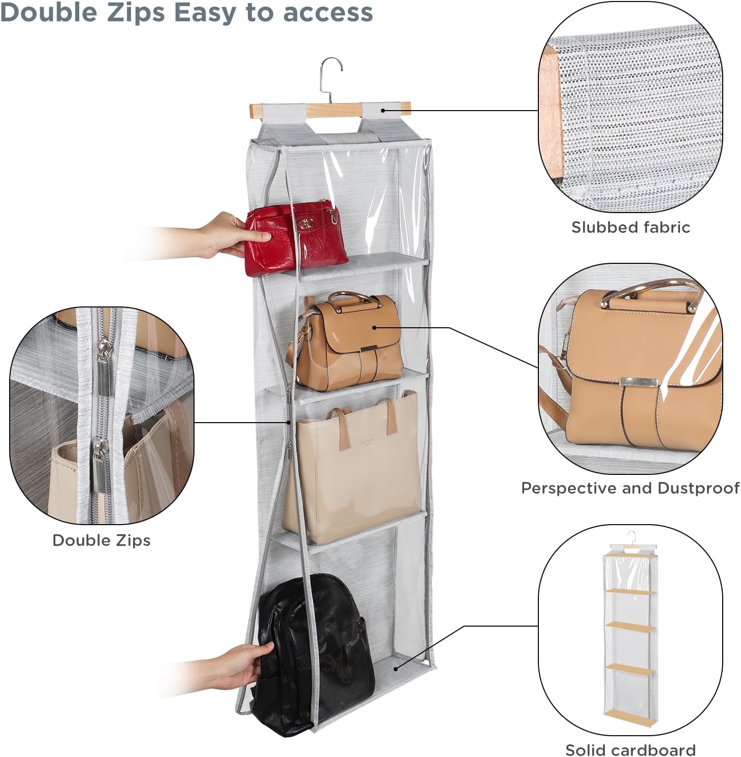 【Two Types of Hooks,Three ways to hang】: The hanging tote bag organizer include a swivel stainless steel hook and two over-door hooks, it’s easy to hang on closets, doors, shelves or wall, allow for easy access to each side thanks to the zippers.