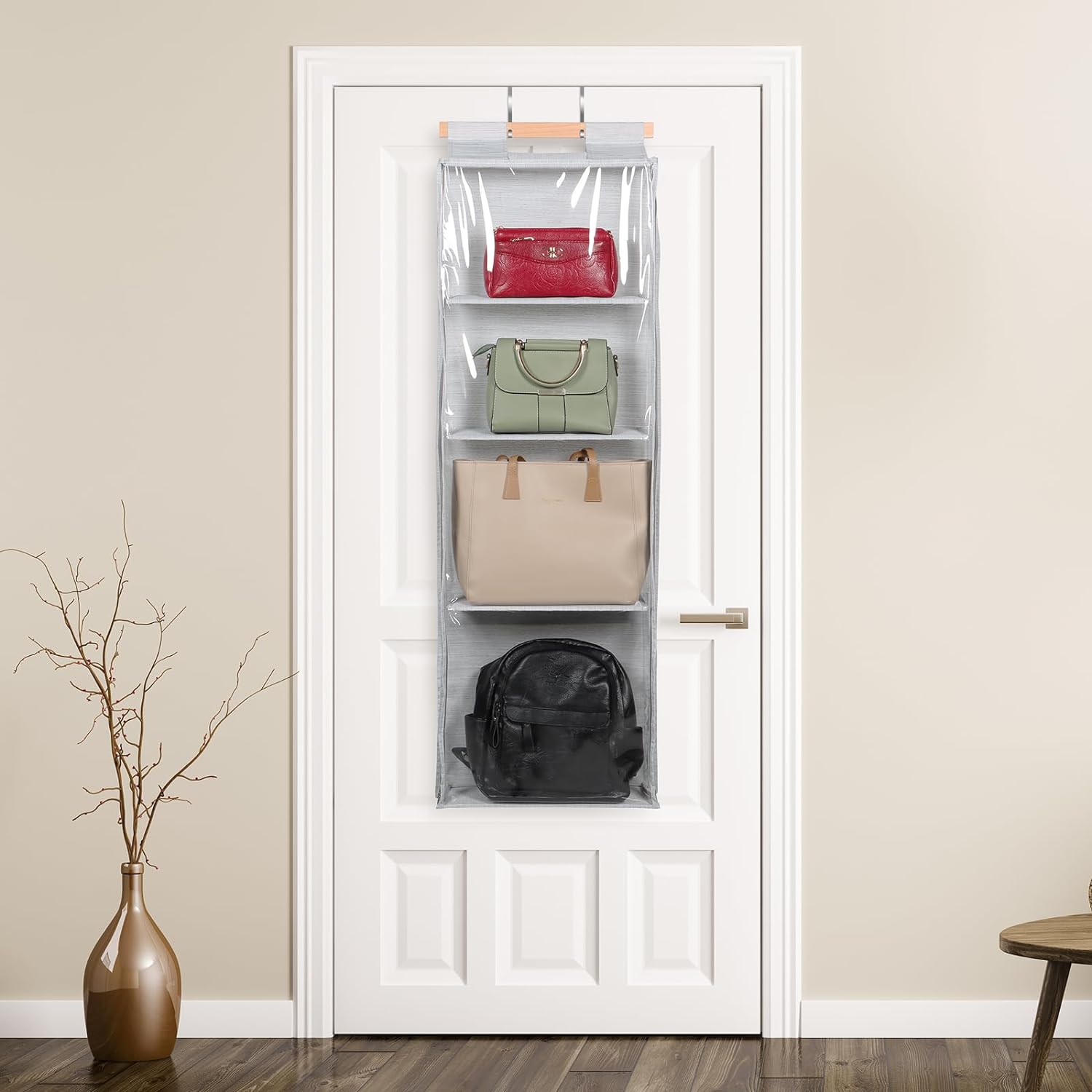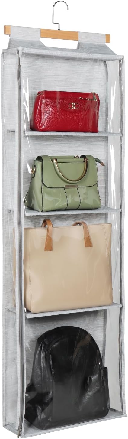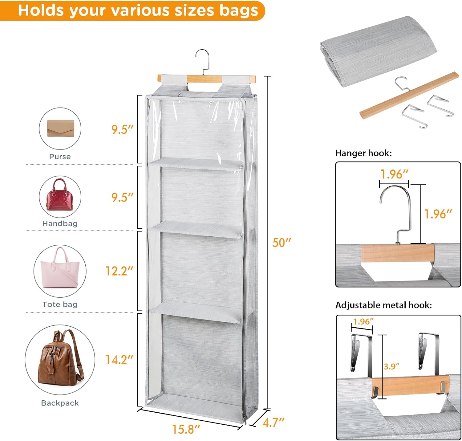 The hanging handbag organizer comes with 2 over-door hooks for you to hang over the door,save your space and keep your home tidy.