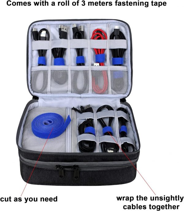 Fastening Tape – This cord organizer bag comes with a roll of 3 meters fastening tape. It will wrap the unsightly cables together and keep them tidy.