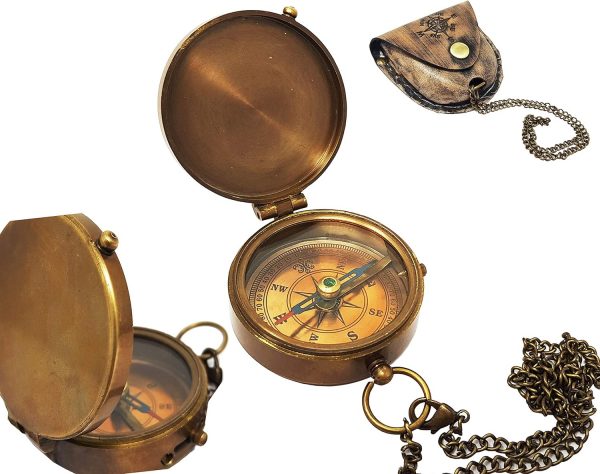 Brass Nautical – Antique Brass Compass Nautical Pocket Backpacking Compass Leather Case Vintage Camping Hiking Direction Marine Graduation Confirmation Day Engravable for Men Quality Travel-11491