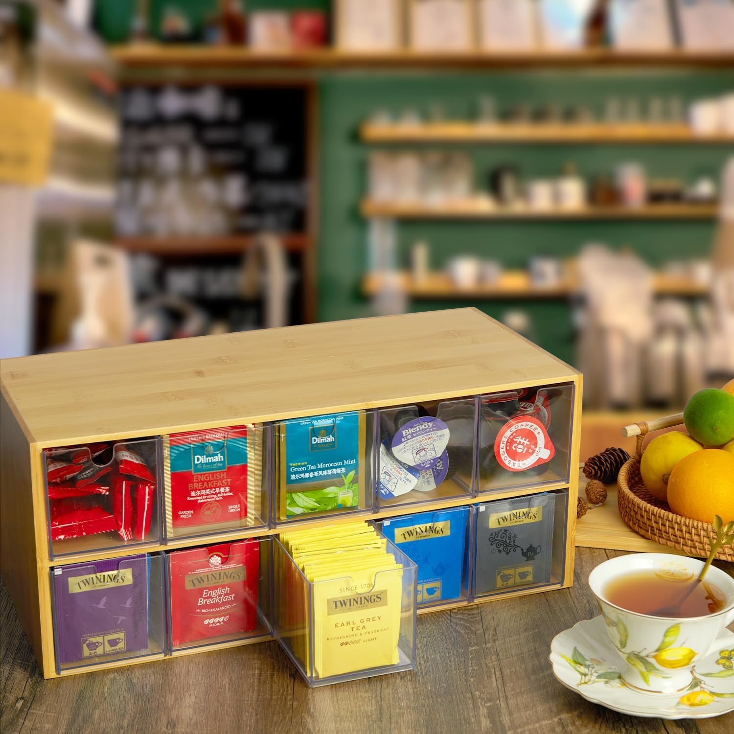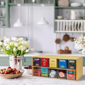 【Mass Storage】-The tea bag organizer is a 2-layer design that includes 10 × acrylic sliding drawers, store different types of tea bags in different zones, making it easier for you to find your favorite tea bags! It is practical and space saving, greatly improving convenience and maximizing space utilization.