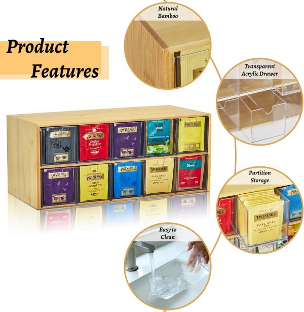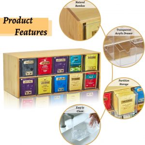 【Special Design】-The tea bag holder organizer transparent acrylic partition will not block the line of sight, and the tea bag will be displayed beautifully. The tea organizer closed design prevents dust and keeps the tea bag clean and tidy. Smooth bamboo surface, no sharp edges, intimate and safe anti-collision design.