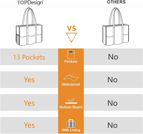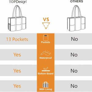 TOPDesign Utility Water Resistant Tote Bag with 13 Exterior & Interior Pockets, Top Zipper Closure & Thick Bottom Support