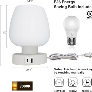 【Upgraded Touch Lamp with USB A+C Charging Ports】This usb table lamp for bedroom built in USB A & type-C (5V/2.1A) for fast charging, can charge your phone, kindle, tablet, watch and other devices no matter the side lamp is on or off.