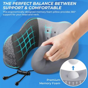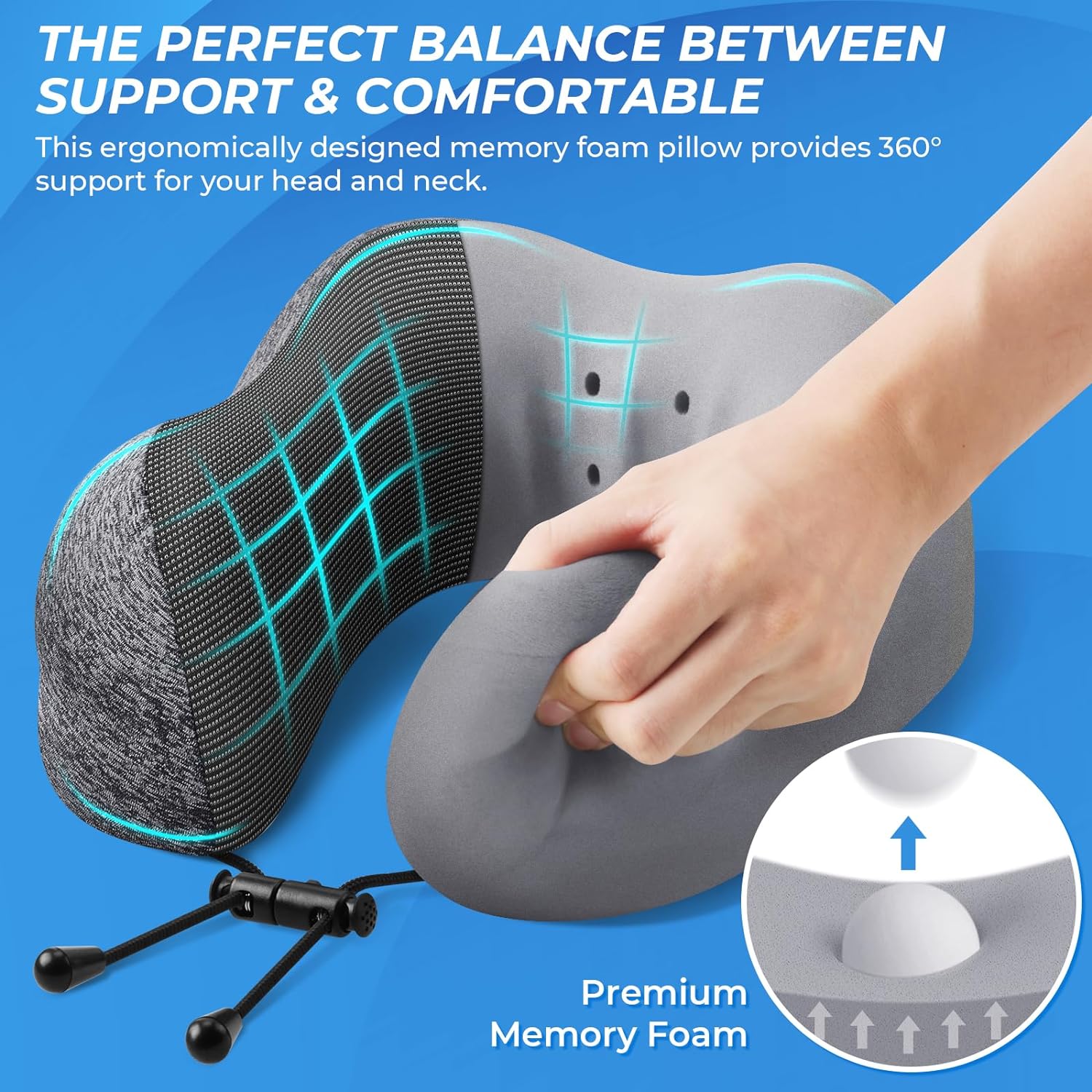 Travel Pillow, Travel Pillows for Sleeping Airplane, Removable Cover Neck Pillow with Adjustable Clasp, Memory Foam Neck Pillow Set with Eye Mask, Earplugs and Storage Bag (Dark Grey)