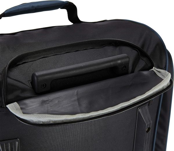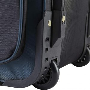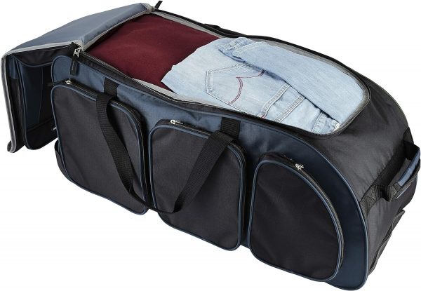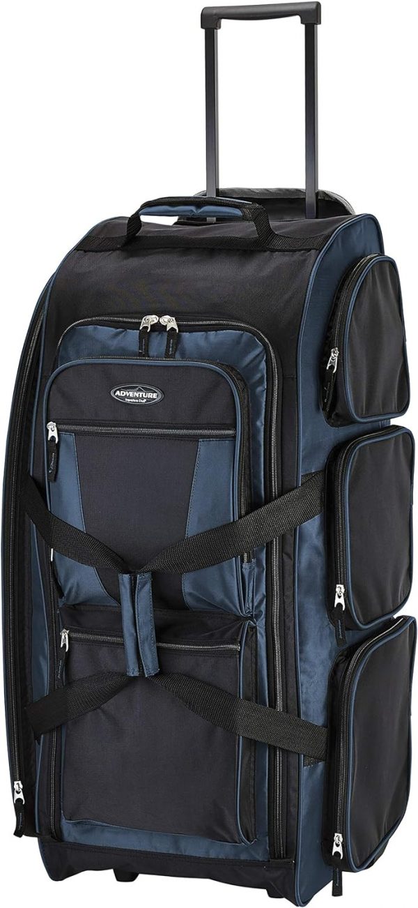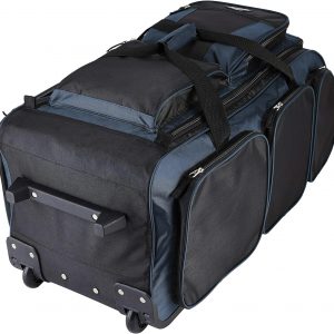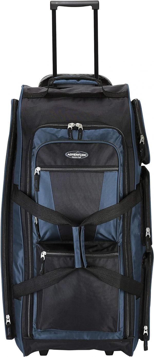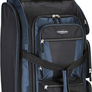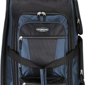 Travelers Club expedition 30″ Rolling duffel is constructed from 600D. Polyester. It has large U-shape opening and extra large zippered accessory pockets.