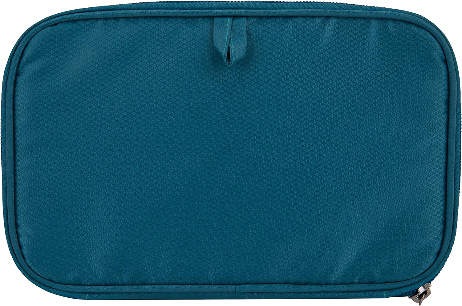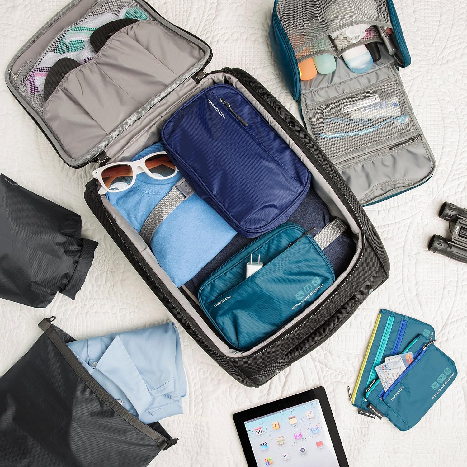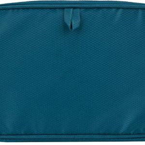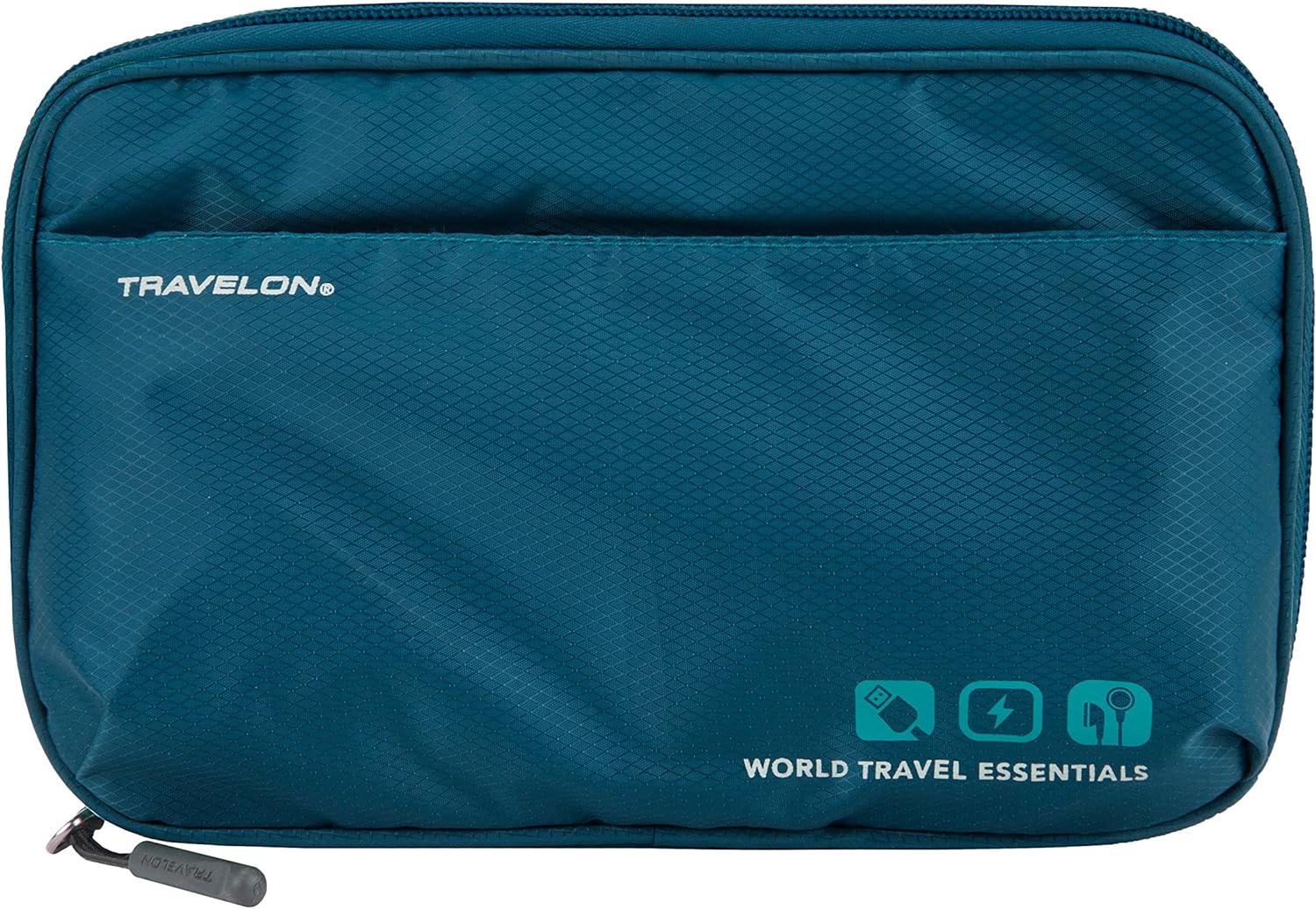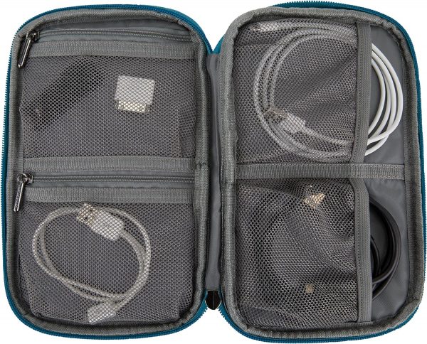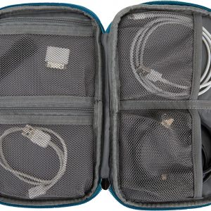 Keep your tech organized. Smart and secure this organizer comes with 4 zippered and open mesh pockets for cords and devices. Front pleated zip pocked holds a power pack or two.