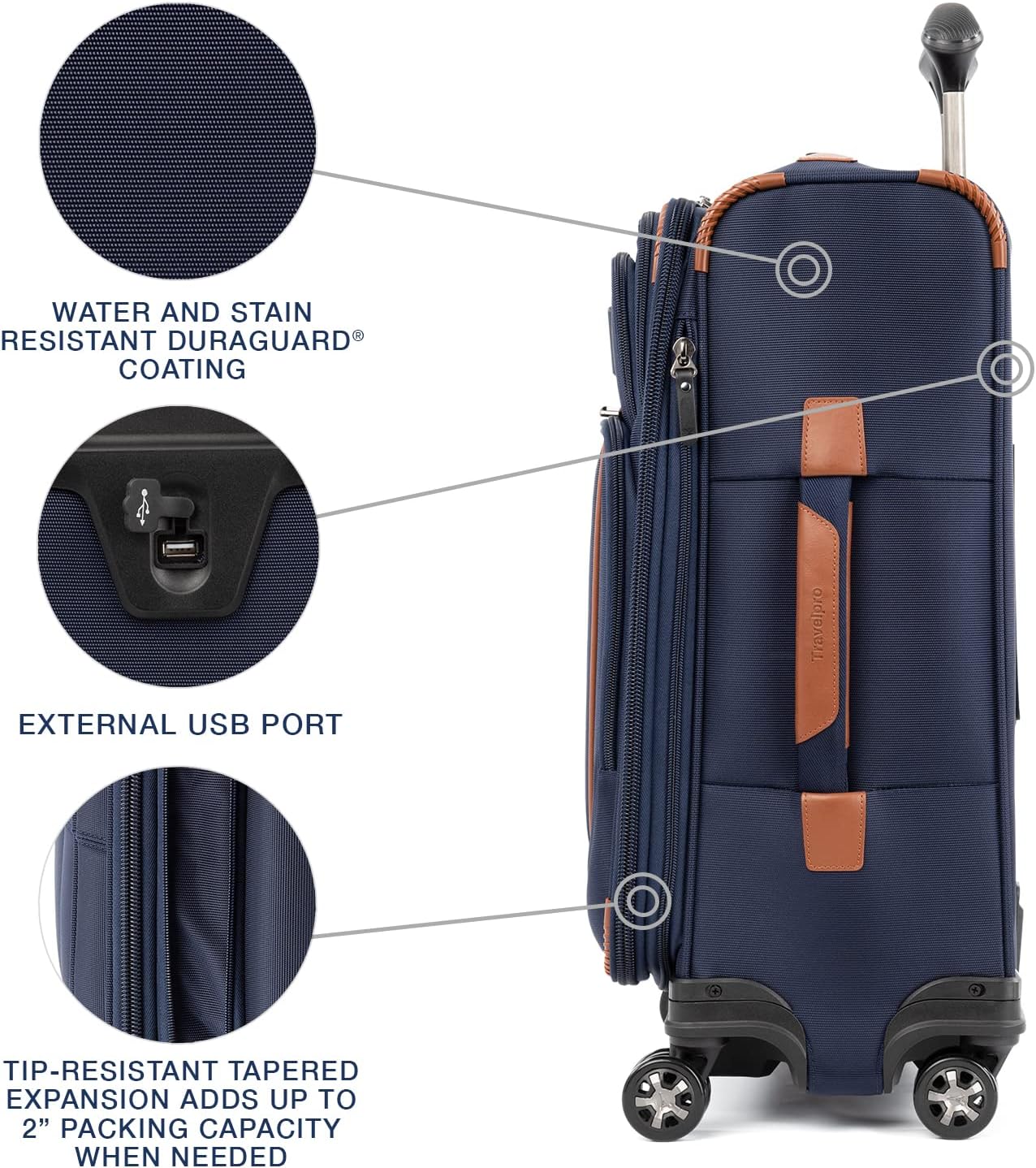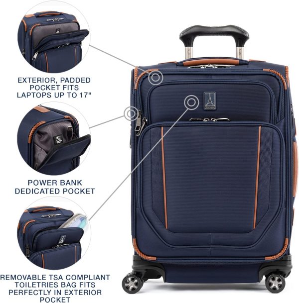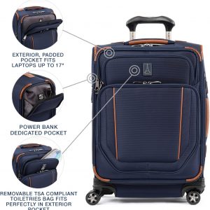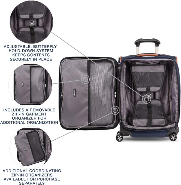Pack to the max with luggage that is truly all your own. The max carry-on expandable spinner is designed for total packing versatility and customizable with a variety of interchangeable Travelpro exclusive zip-in organizers. Included inside the lid is a removable zip-in garment organizer, ideal for storing folded shirts, dresses and jackets. Also available for purchase separately are four additional coordinating Travelpro exclusive zip-in organizers-a laundry organizer for bathing suits, workout clothes and other damp items, A packing cubes organizer for shorts, shirts and accessories, A suitor organizer to keep hanging clothes wrinkle-free and an all-in-one organizer for wet and dry storage (each sold separately). created for domestic travel on larger aircraft, this bag is sized to max out the sizer bin and fit In the overhead bins of most major yours. Airlines. It also features a tip-resistant zippered expansion to increase packing space up to two inches, but be careful not to overpack the exterior pockets and risk making it too big for the sizer bin. Enjoy total convenience with a built-in USB port and dedicated exterior power bank pocket, exterior padded laptop pocket and removable TSA-compliant toiletries bag that stores perfectly in a same-sized exterior pocket. Plus, this spinner’s precision glide system ensures precise control and effortless roll on eight ultra-durable, 360 degree magnatrac spinner wheels led by a four-stop, height-adjustable PowerScope handle with comfortable Contour grip. Built for professional-grade dependability With robust corner armor, skid guards and heavy-duty wheel housings, crew versapack is the civilian version of the luggage flight crews use, tested to meet the same superior quality and durability standards. This spinner is further backed by the comprehensive built for a lifetime limited warranty with our trusted companion promise.