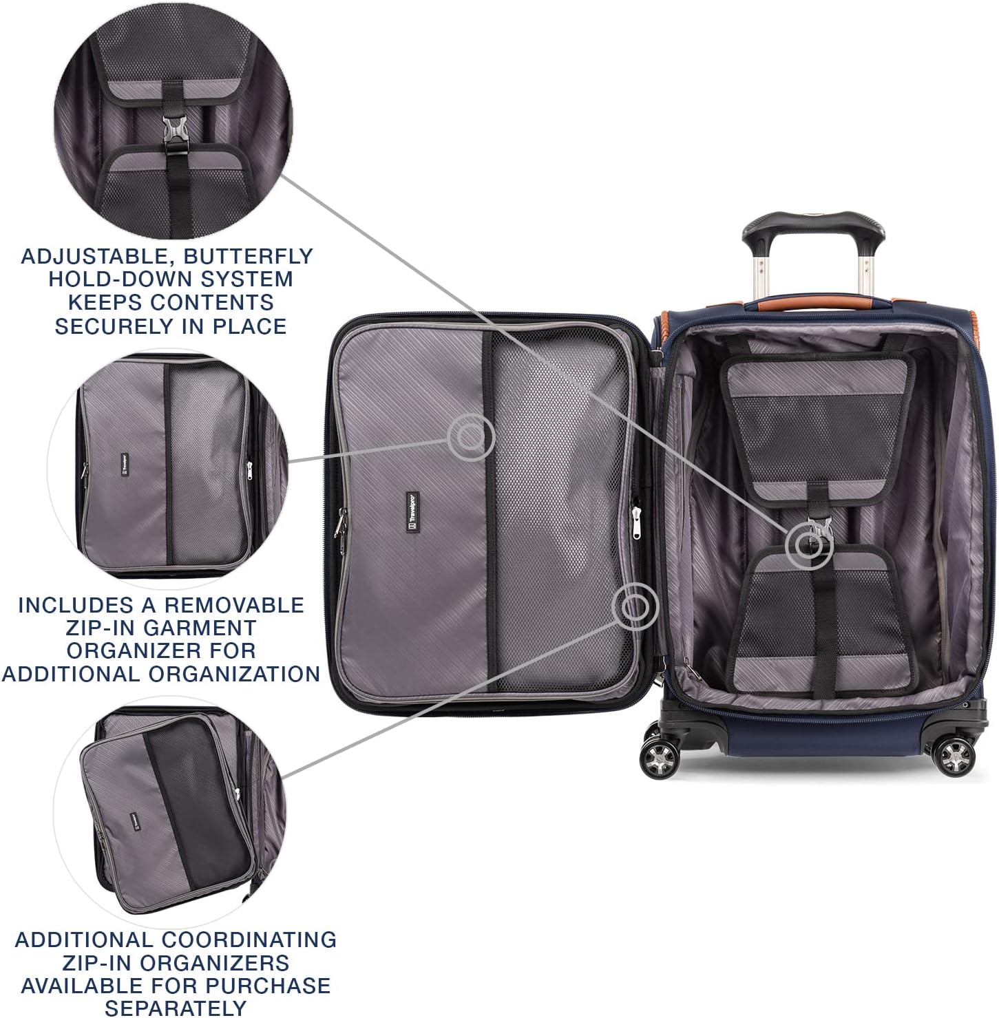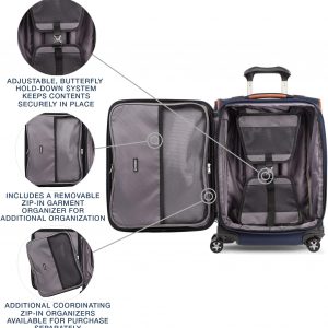 Maximizes carry-on sizer bin restrictions. May need to check if over packed. Includes a Zip-In Garment Organizer for folded shirts, dresses and jackets. Additional coordinating Zip-In Organizers available for purchase separately: Laundry Organizer, Packing Cubes Organizer and All-In-One Organizer (each sold separately)