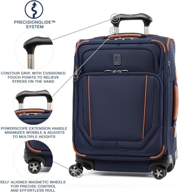 PrecisionGlide System for precise control and effortless roll includes a Patented Contour Grip to relieve the stress on your hand for more comfort and greater control of your spinner luggage, an airline-grade Patented PowerScope Extension Handle that adjusts to multiple heights while minimizing wobble and self-aligning magnetic wheels that roll straight in any direction.